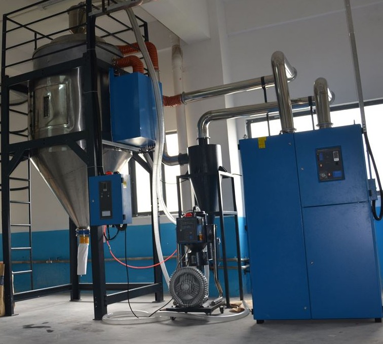 中央供料系統(tǒng)采用高壓風(fēng)機真空輸送方式,通過集中的管路系統(tǒng)將塑料原料從儲料罐輸送到中央干燥系統(tǒng),然后將干燥后的原料輸送到每臺注塑機中。