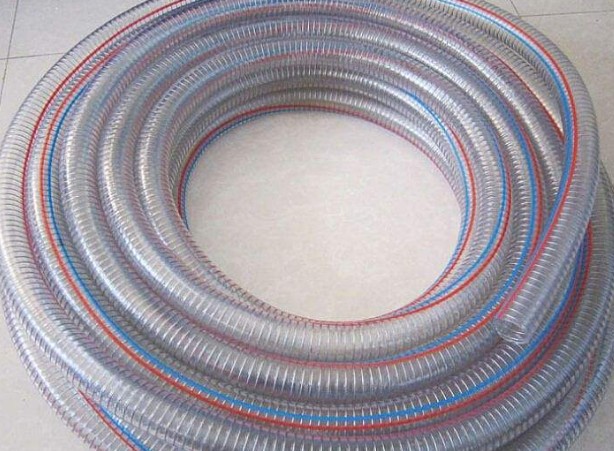 鋼絲軟管:即內置有鋼絲的軟明軟管,其管材為三層結構,內外兩層是PVC軟質塑料,中間一層是鋼絲增強結構,或者是鋼絲網或者是螺旋鋼絲。